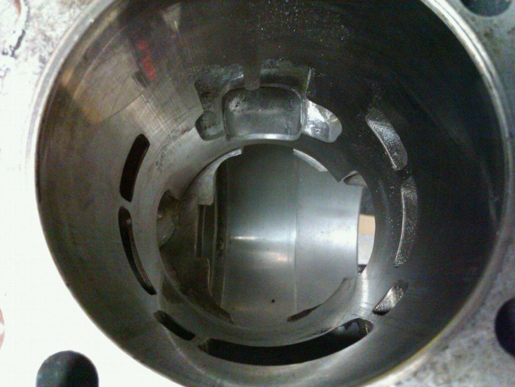 Next thing to look at was how the gas flowed through the side cuts and up the transfers. At BDC the gap/area was at its smallest and so we looked at other Lambo pistons to see how we could open the piston up a little. See how we opened the area up below.