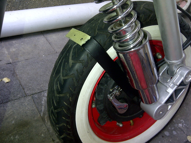 Got the front mudguard all sanded down and painted today, all was looking good as i flatted the paint off and got ready to fit the finished item to the scooter - as i dogged up the bolts feeling very pleased with my efforts my heart sunk when one of the bolts sheered off (the weld broke) this meant another bolt had to be welded in - bang goes the effort of painting it.