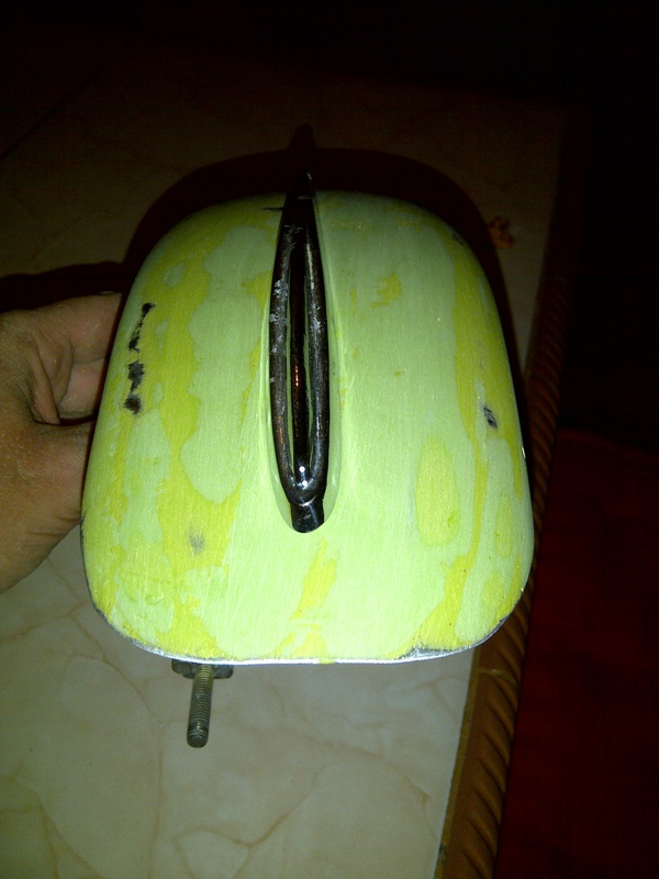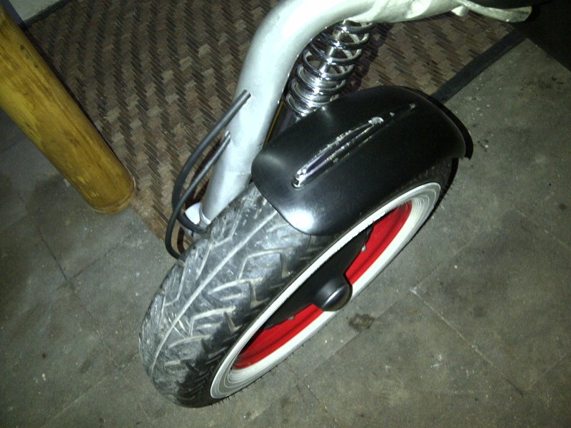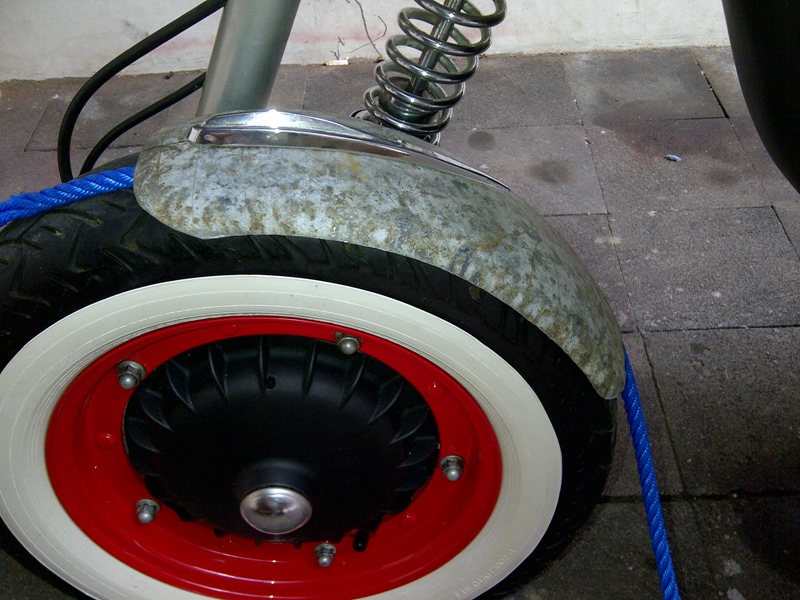 Got the front mudguard all sanded down and painted today, all was looking good as i flatted the paint off and got ready to fit the finished item to the scooter - as i dogged up the bolts feeling very pleased with my efforts my heart sunk when one of the bolts sheered off (the weld broke) this meant another bolt had to be welded in - bang goes the effort of painting it.