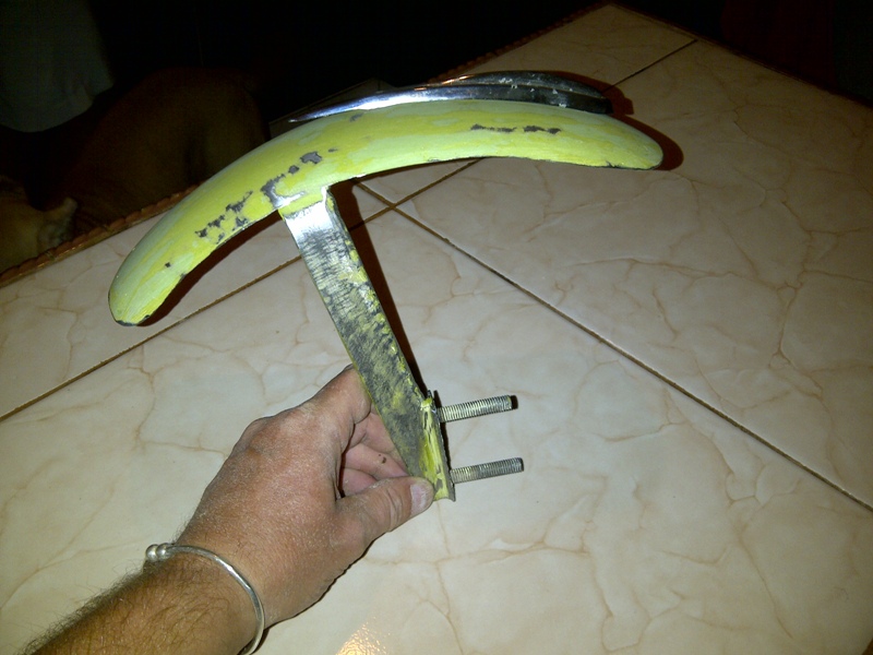Finally the Hugger muguard _ this individual task has become a labour of love and at times stress to, the plate and the bracket were mocked up in card board and then cut from 1.5 plate steel flat bar, it looked good on paper (and cardboard ) but after fabrication the support bar hit the side of the front tyre. This was rectified by cutting the bar off again and welding the lower shock bolts to the plate itself and grinding off the heads to allow the mudguard support bar to be welded in the centre of the plate giving another centimetre of clearance between the bar and the side of the tyre. So far so good. The mudguard itself has a stiffener (flat bar) on the under side and this is where the 2 pieces were to be lined up and marked (via 2 drill holes) and made ready for welding.