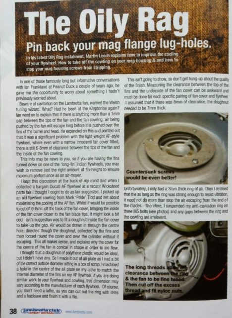 Slightly off-topic but still relevant to the air cooling discussion, I seem to remember that Ian Frankland has previously raised issues with regard to fin size underneath flywheel cowlings. According to Martin Leech (Knowledge) who wrote on this for Jet Set last year, Ian believes that if there is anything more than a 1mm gap between the tips of the fan and the cowling, air being pushed by the fan will escape long before it is pushed over the fins of the barrel and head. This is particularly the case for lightweight AF flywheels, where there is apparently a large gap between the fins and flywheel cowl.